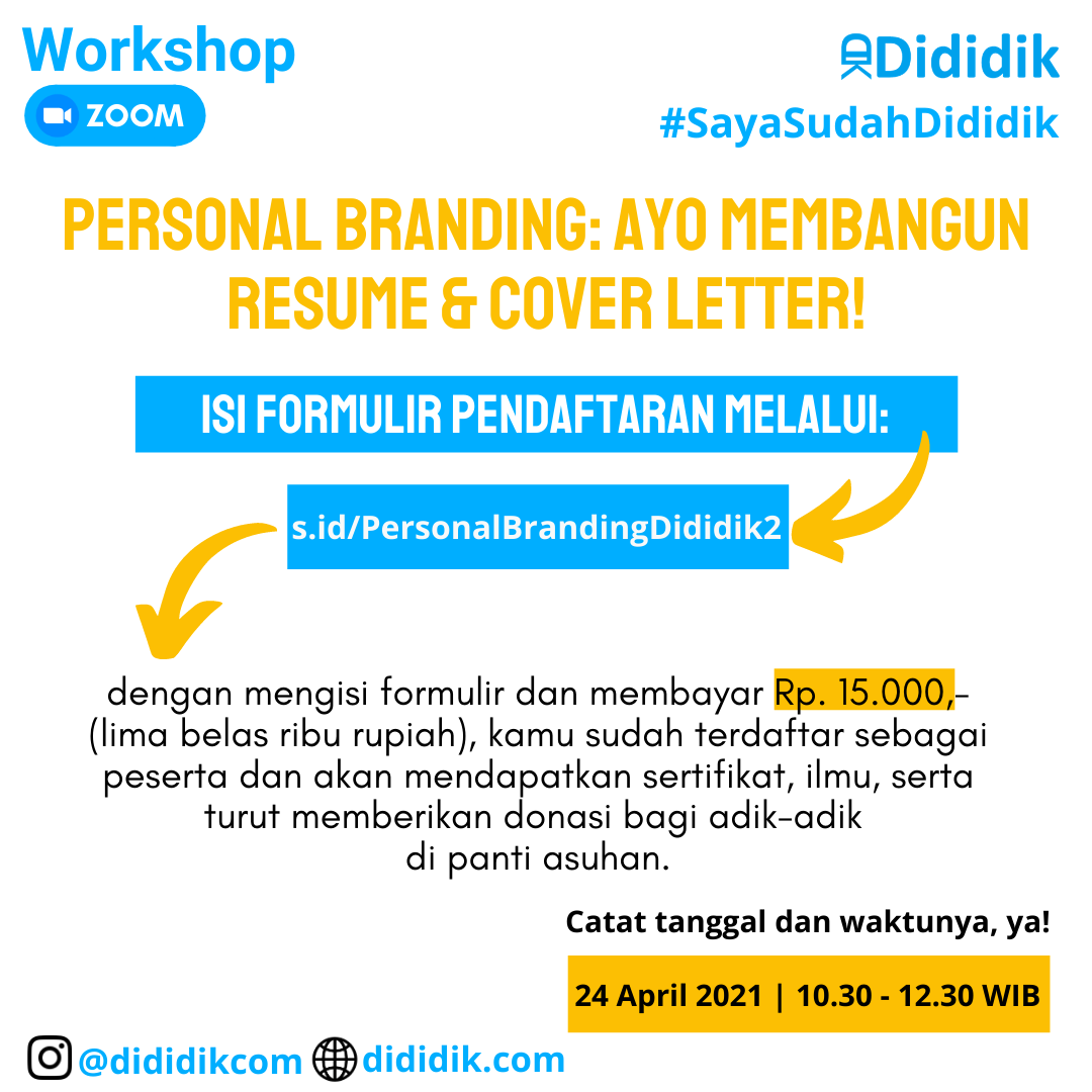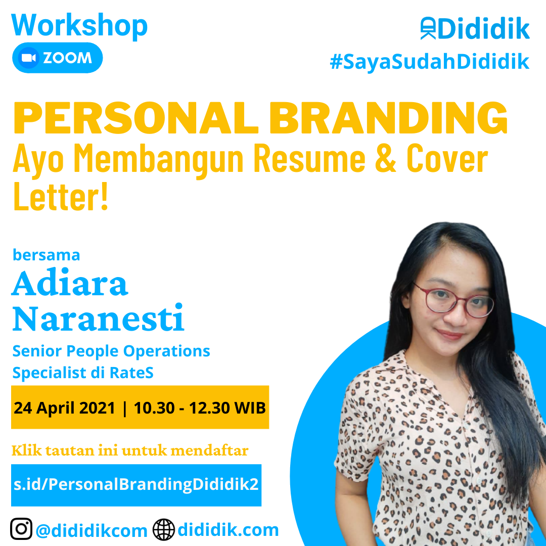 Yuk, ikuti workshop Dididik “Personal Branding: Ayo Membangun Resume & Cover Letter!” pada hari Sabtu, 24 April 2021 bersama Adiara Naranesti, Senior People Operations Specialist di RateS!